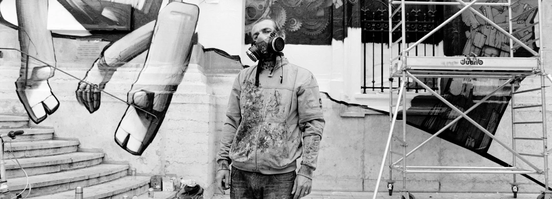 Cédric Kozluk, né à Lyon en 1976, est avant tout un amoureux du dessin. Et c’est en 1991 que cet amour le mène à la rencontre du graffiti et de son univers subversif. De cette rencontre naît Brusk, un artiste polymorphe, tout à la fois graffeur, muraliste, peintre, dessinateur, sculpteur, mais surtout narrateur d’un monde à la dérive dont il sublime les souffrances et les injustices par une esthétique explosive et percutante